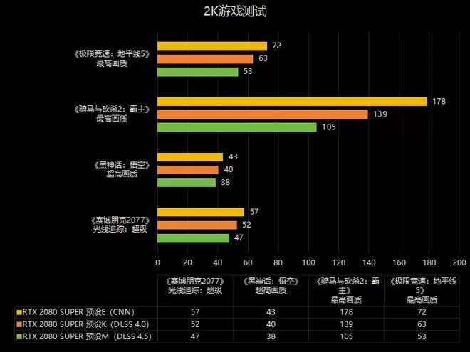 总的来说,这代DLSS 4.5的提升是比较大的,在画质层面带来较为显著的改善。但是对20系和30系这种老卡来说,DLSS 4.5的正向收益就不那么明显了,由于模型计算量大幅增加,20系和30系显卡的Tensor Core不支持FP8运算,所以会存在不小的性能开销,2K分辨率下的游戏平均帧率比传统CNN模型低了24%,对不支持帧生成的RTX老卡影响非常大,相比之下DLSS 4.0对帧率的影响小一些,画质也比CNN模型好得多,可能更适合20系和30系显卡。