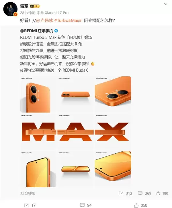 REDMI Turbo 5 Max新机主打的新配色名为"阳光橙",与小米品牌LOGO底色接近。官图公布后,雷军第一时间进行了转发,并大赞"好看"。