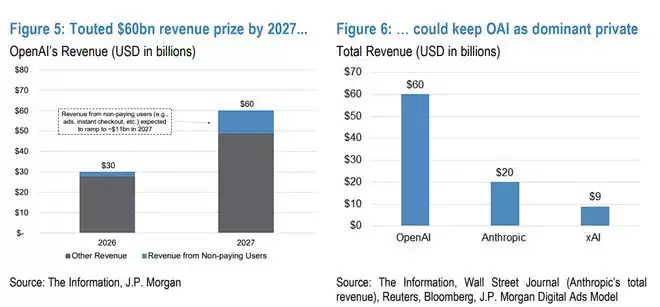 研报称,据The Information报道的数据,OpenAI的收入目标极具野心,其中2026年总收入目标300亿美元,其中约20亿美元来自非付费用户(广告、购物等)。2027年总收入目标翻倍至600亿美元,非付费用户收入激增至约110亿美元。
