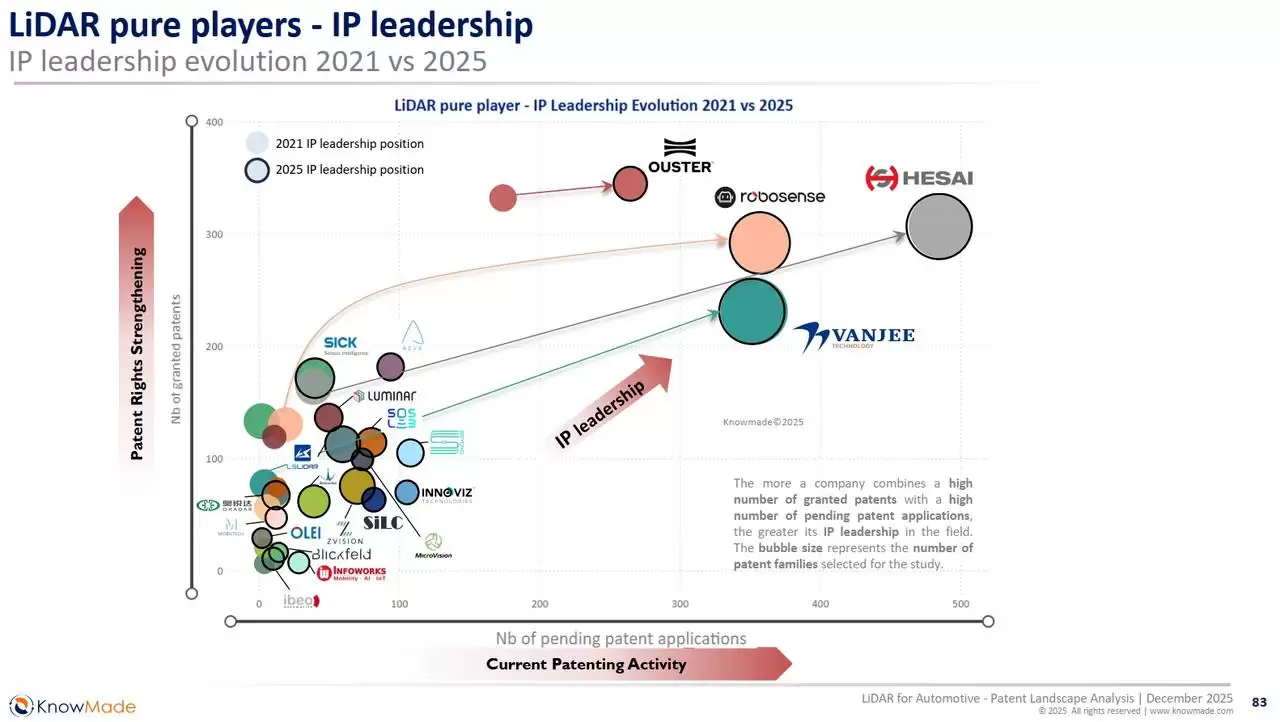 近期,Yole Group旗下的全球知名知识产权智库KnowMade发布了最新报告《汽车激光雷达专利全景分析-2025版》。这份报告显示,禾赛在激光雷达领域的专利布局表现卓越,其专利实力位居全球行业前列。