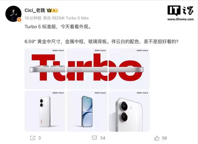1月26日,IT之家报道,今天上午,小米中国区市场部总经理魏思琪公布了Redmi Turbo 5标准版的官方渲染图。据介绍,新机将采用6.59英寸的“黄金中尺寸”屏幕,并配备金属中框与玻璃背板,提供“祥云白”配色。