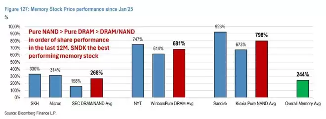 图注:自2025年1月以来,存储股虽然普涨,但纯DRAM和纯NAND标的的表现开始分化。摩根大通认为纯NAND标的(如铠侠)将在接下来的周期中展现更强弹性。
