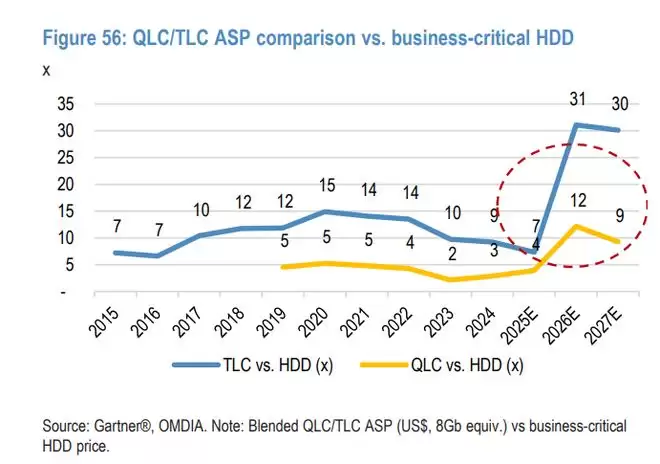 因此,现在的NAND扩产不再是简单的“买设备”,而是艰难的“技术迁移”。摩根大通预测,2026年全球NAND晶圆产出(Wafer Output)的同比增速仅为3%,这意味着供应增长几乎完全依赖技术升级(层数堆叠),而非新厂扩能。而在比特需求高达21%的增速下,这种供给侧的结构性限制将导致全年处于供不应求状态,支撑ASP暴涨40%。