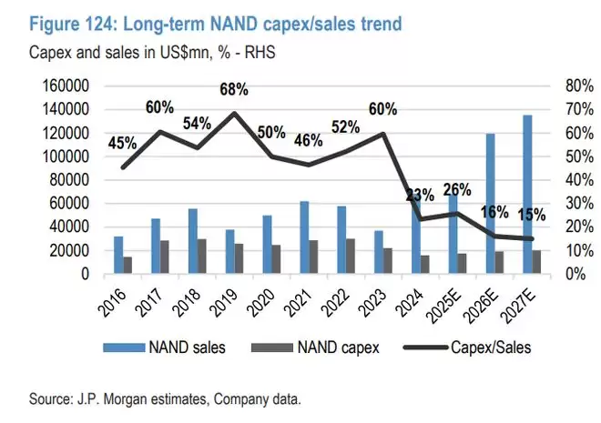 数据显示,未来三年NAND行业的资本开支(Capex)占销售额的比例将降至15%-16%的水平。作为对比,过去十年这一比例常年维持在30%-50%,2018年甚至达到过68%的峰值。