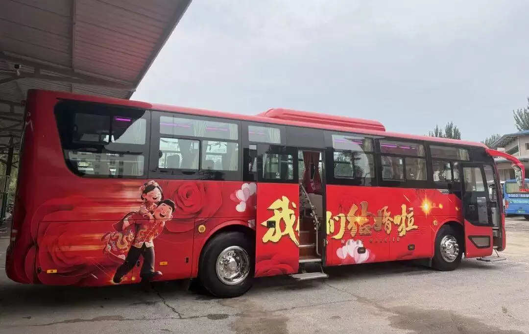 这辆别具一格的“大巴婚车”由张家口京西公共交通有限公司精心打造。车内采用软包卡座设计,营造出舒适惬意的移动婚庆空间,车厢内随处可见“百年好合”“永结同心”等祝福语。据公司负责人介绍,车辆内外均经过特殊改造,既保留了公交车的实用功能,又融入了婚庆元素,旨在为新人提供全新的婚礼体验。