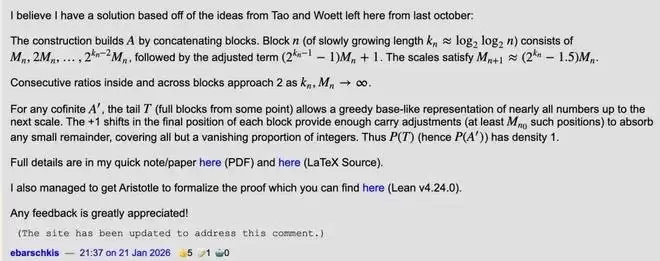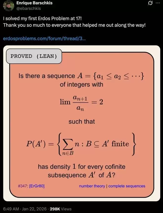 这个构想在讨论区挂了三个月,直到 2026 年 1 月 21 日晚上,这个 17 岁的高中生 Enrique 发帖宣布:他完成了完整的证明。