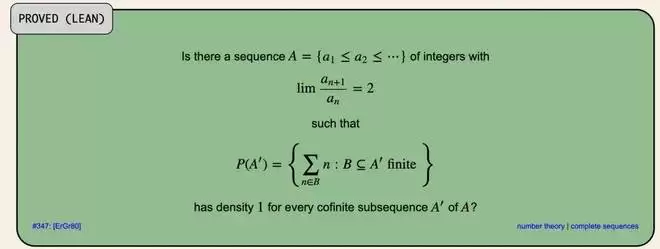 埃尔德什第 347 号问题,最初由埃尔德什和格雷厄姆在 1980 年提出,核心问题是:是否存在一个整数序列,其中相邻项的比值趋近于 2,并且对于该序列的任何余有限子序列,其有限子集和构成的集合在自然数中的密度都是 1?