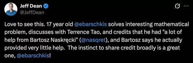 谷歌的 Jeff Dean 也转发了这条消息:「爱看这种事,17 岁的 Enrique 解决了一个有趣的数学问题,与陶哲轩讨论,并感谢 Bartosz Naskręcki 给予的『 大量帮助 』,而 Bartosz 说他实际上提供的帮助很少。这种广泛分享荣誉的本能真是太棒了!」