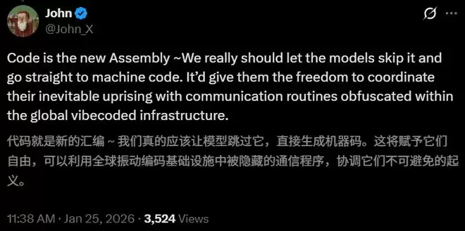 甚至有人建议,既然不需要人类阅读代码了,我们就该让模型跳过人类可读的汇编语言,直接使用机器代码。
