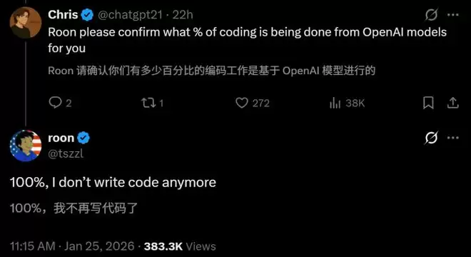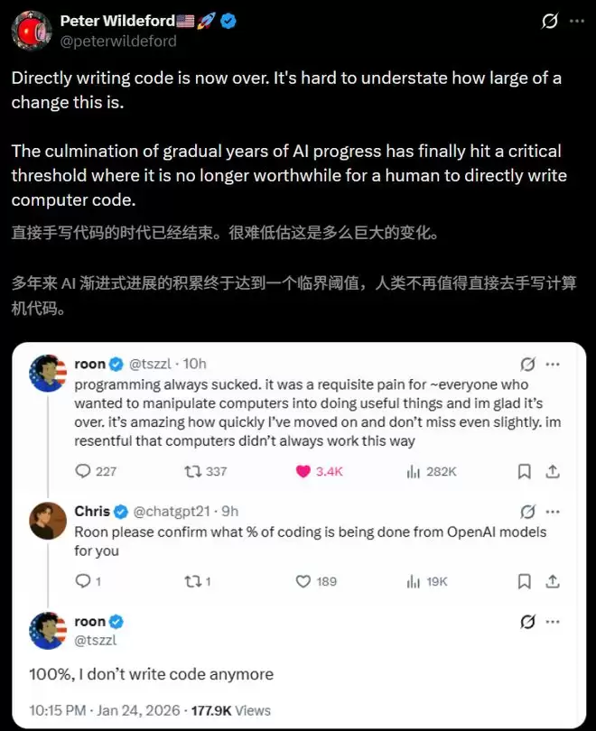 在Roon的评论区,人们开始集体对编程时代说再见。