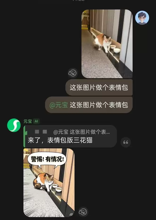1月26日,元宝开始内测另一个社交玩法。记者在元宝点入“派”,选择“创建派”,邀请微信、QQ好友进入“派”群后可以聊天,“派”群中还有腾讯会议和元宝。记者@元宝,元宝便能分析当日热点股票,并解答其他相关问题,还能总结聊天内容。点击腾讯会议的头像,则能进行音视频对话。记者还发送了一张三花猫的照片,让元宝生成一个表情包,元宝生成了卡通化的表情包,配文“警惕!有情况!”