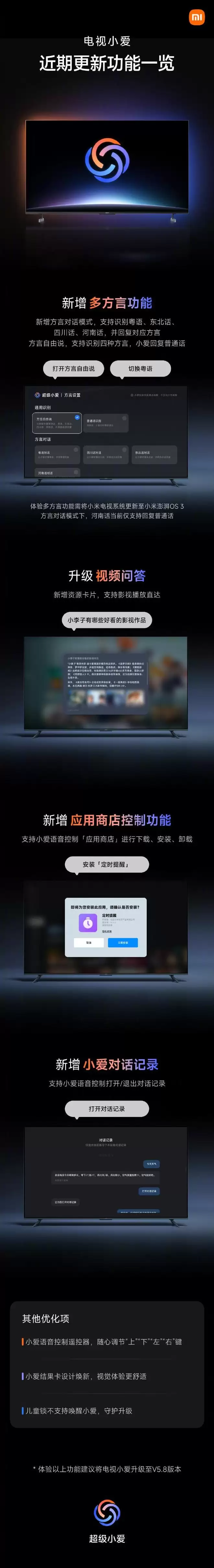 IT之家1月26日讯,小米电视于今日发布了“超级小爱”近期的功能更新概览,官方建议将电视端小爱同学升级至V5.8版本。