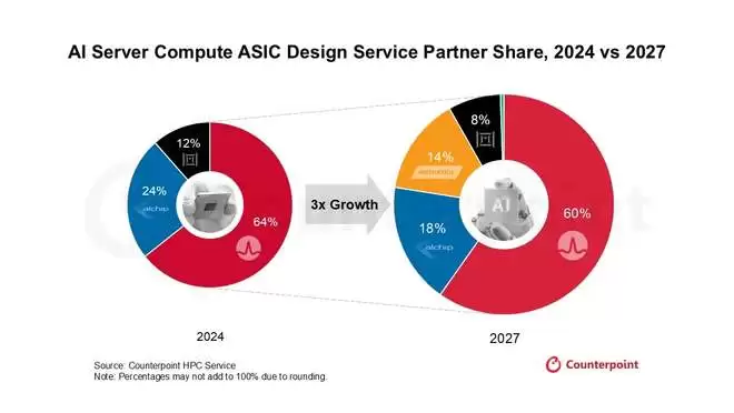 而在设计服务伙伴方面,博通的市场份额预计保持稳定;联发科凭借谷歌TPU v8x“Zebrafish”推理芯片等订单积极争夺份额;美满电子与世芯尽管销售数量都将显著增长,但其市场占比预计会出现萎缩。