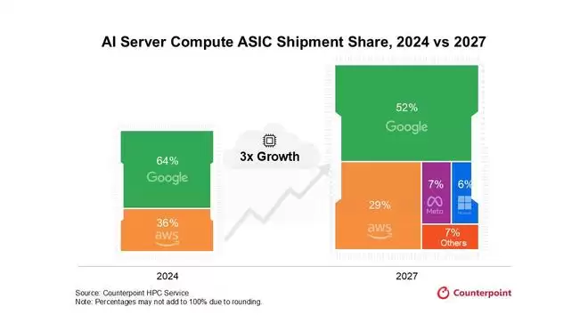 从出货规模来看,谷歌在AI ASIC市场的主导地位仍将延续,尽管其市场份额预计会出现明显下滑。
