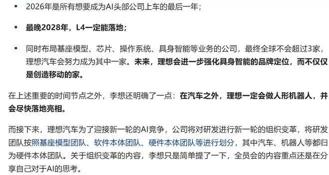 为实现这一战略转型,研发体系的重组成为关键举措。理想汽车将原有团队拆分为三大业务板块:底座模型团队专注于Mind GPT等核心AI技术研发;软件本体团队负责智能座舱、自动驾驶等系统的迭代升级;硬件本体团队则整合汽车、机器人等实体产品的开发。这种“模型-软件-硬件”协同架构,旨在实现跨品类技术复用与资源的高效配置。李想曾在2025年 “AI Talk” 活动中预言:“人工智能的汽车化将成为家庭科技普及的关键突破口”,此次组织调整被视为该理念向实践层面的重要延伸。