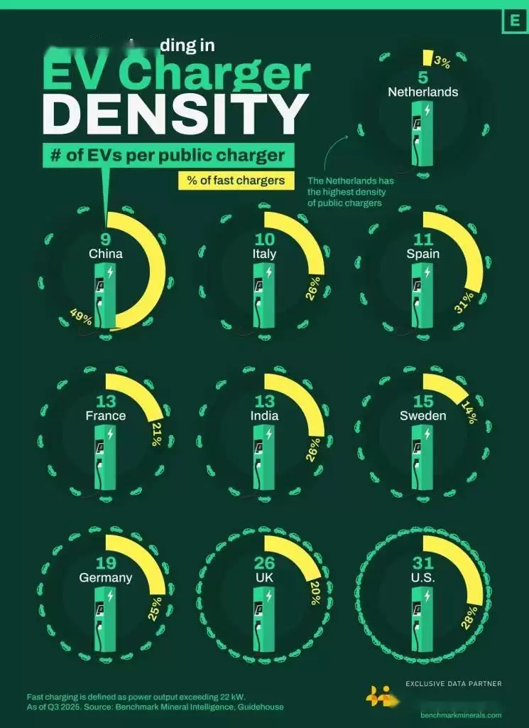 荷兰以5:1的车桩比位居全球首位,平均每5辆电动车就能共享一个公共充电桩。不过值得注意的是,该国快充设施占比仅为3%,在快速补能领域存在明显短板。中国则以9:1的车桩比位列第二,更引人注目的是其快充桩占比高达49%,在高速充电网络建设方面建立了独特优势。