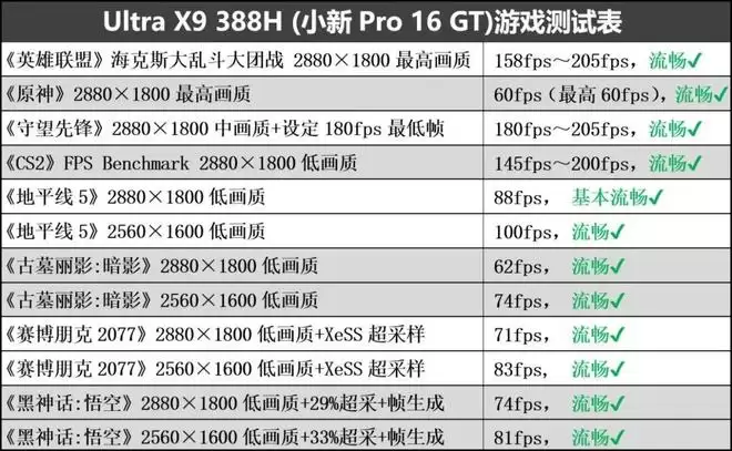 那么接下来的问题就是:B390能达成何种实际表现呢?以往的集显本,充其量玩玩《英雄联盟》这种“轻量级网游”,连《原神》这种动漫风格网游都无法满分辨率高画质应对。按摩店家的主流集显实际游戏性能稍强,也就能FHD低画质玩玩轻量级3A游戏。而Arc B390,则把集显本拉高到了“2.5K/2.8K分辨率流畅运行部分3A游戏”的高度。来看看游戏实测▼: