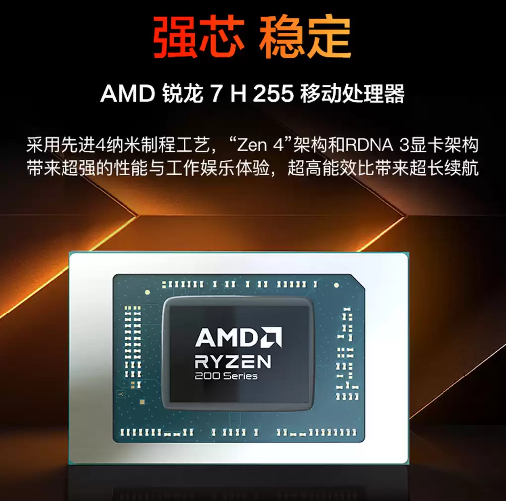 这款笔记本搭载了AMD锐龙R7 H 255移动处理器,采用8核16线程架构,最高主频可达4.9GHz,并集成Radeon 780M核显。机身采用全金属材质,重量为1.45千克,支持178度开合。它采用了并联双热管与双风扇的散热结构,能够确保长时间高负载运行的稳定性。