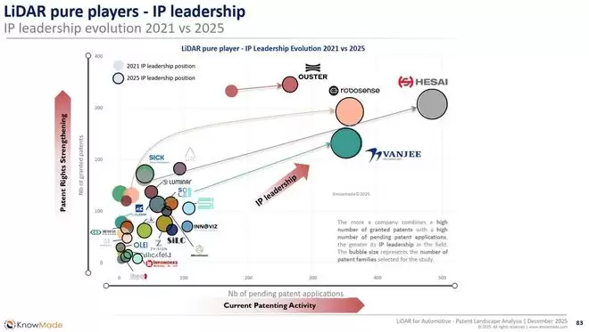 ▲ 激光雷达专利领先地位的演变:2024 vs 2025