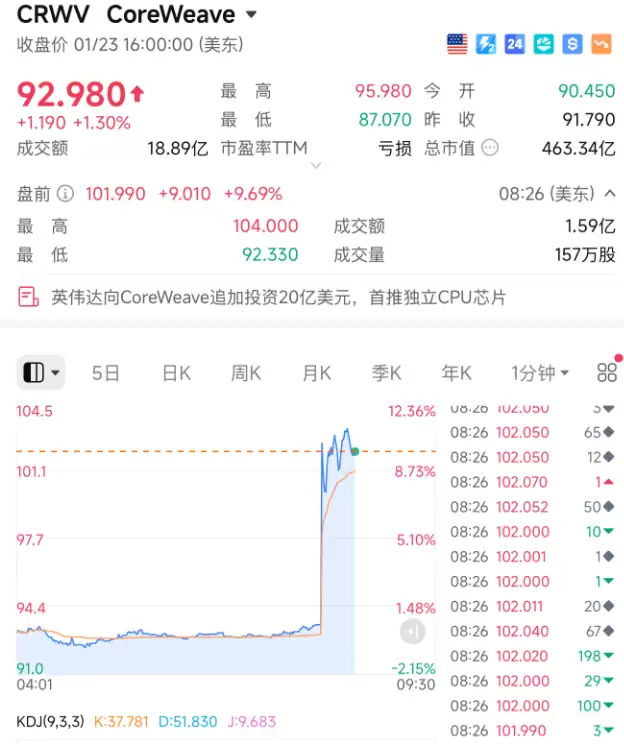 消息传出后,CoreWeave盘前股价直线拉升,涨幅超过9%。