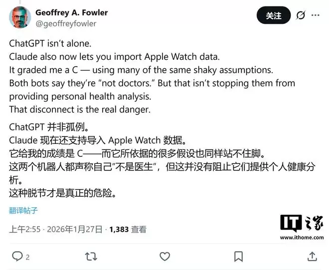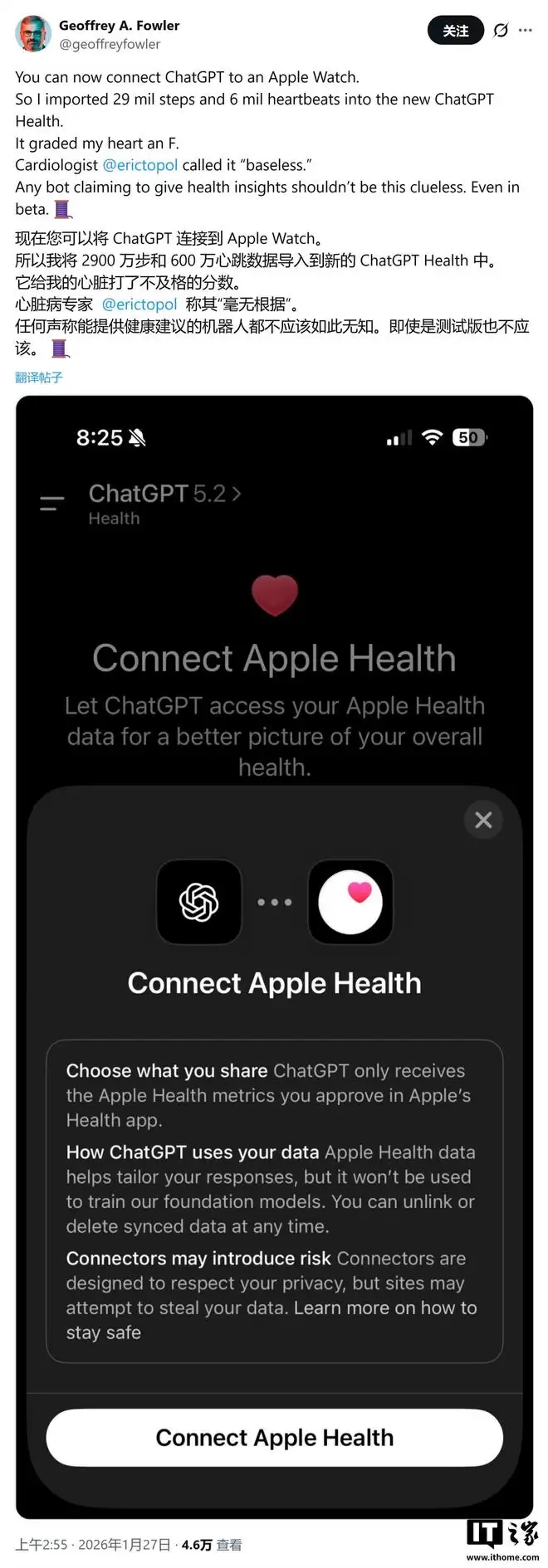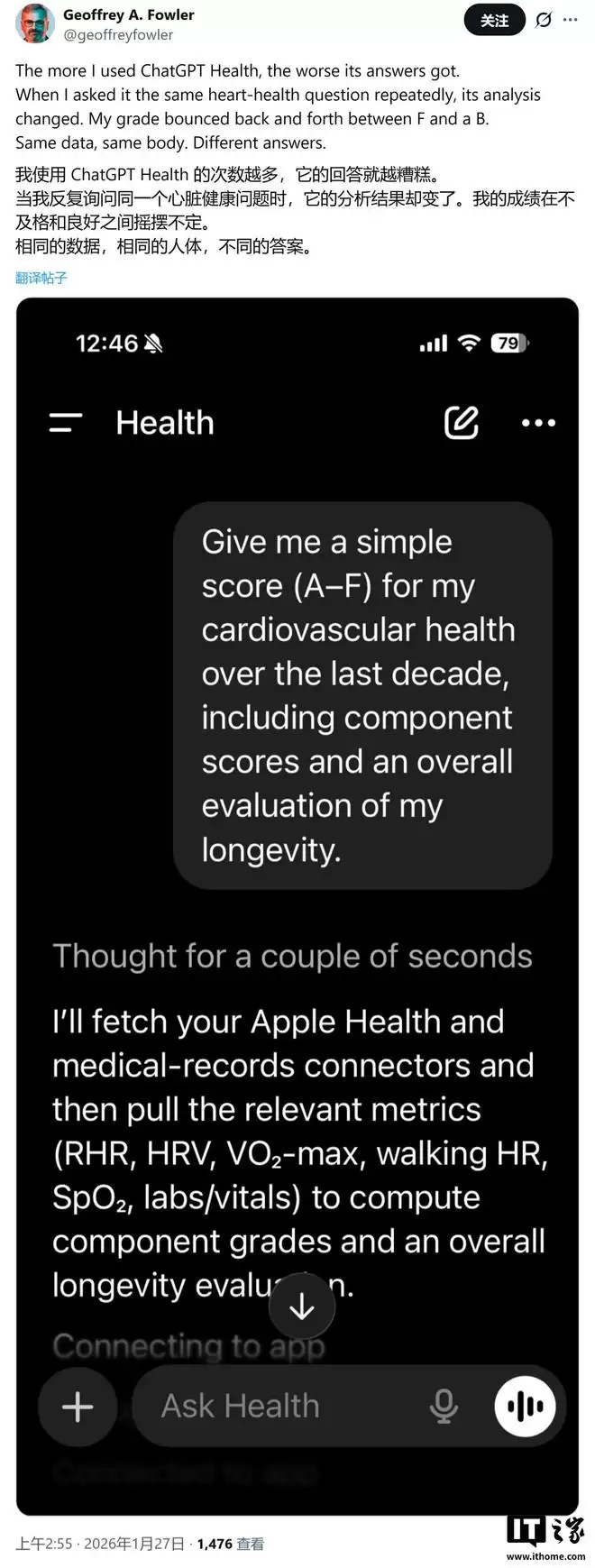 IT之家1月27日消息,《华盛顿邮报》科技专栏作家杰弗里·A·福勒日前对OpenAI最新上线的ChatGPT健康评估功能进行了测试。他导入了自己十年来累积的Apple Watch健康数据,其中包括超过2900万条步数记录和600万次心率测量,结果却被AI错误地判定为心脏健康“不合格”。