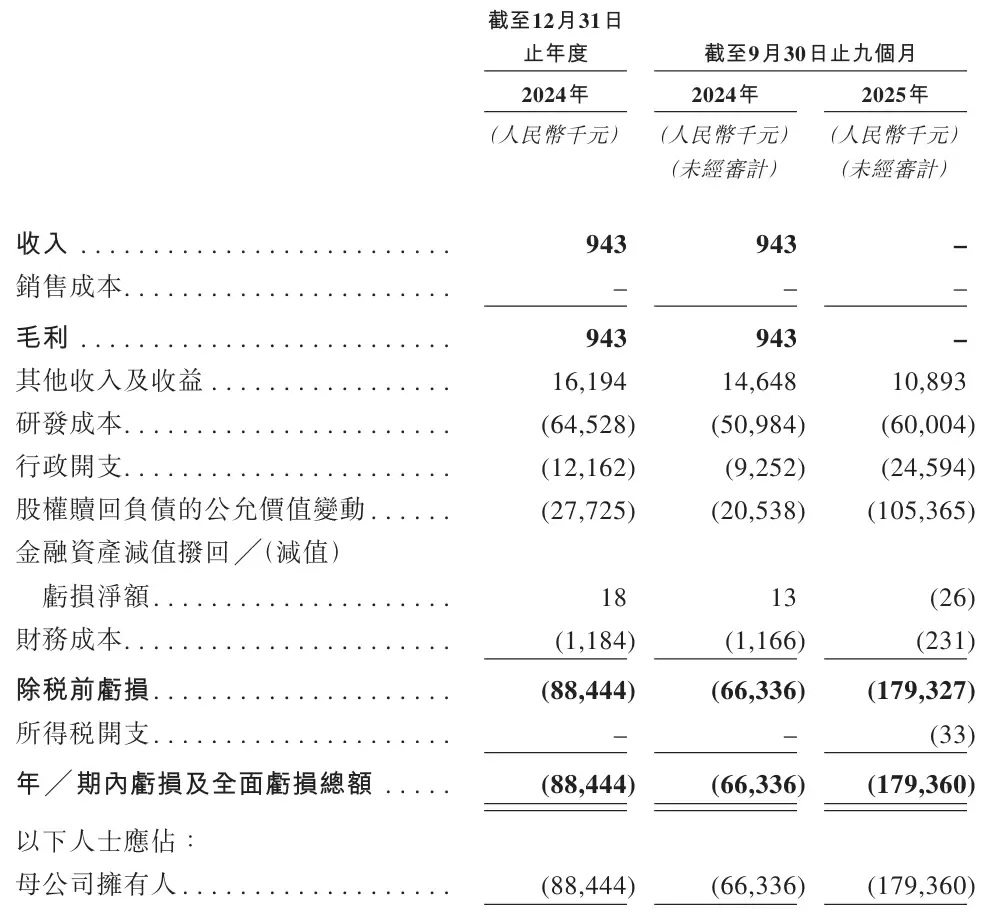 招股书披露的数据显示,邦顺制药在2024年实现营收94万元,期内亏损8844万元;2025年前九个月,公司尚无营业收入产生,期内亏损进一步扩大至1.79亿元。