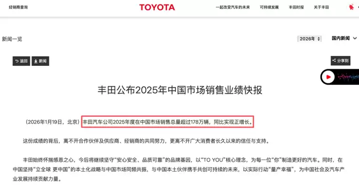 其中,丰田在中国卖了超过178万辆车,同比增长0.23%。这个增幅不大,但很关键——这是丰田自2024年负增长后,首次转正。上汽通用汽车的表现更明显一些,全年销量53.5万辆,同比增长22.99%,终于结束了自2018年开始的“七连跌”。