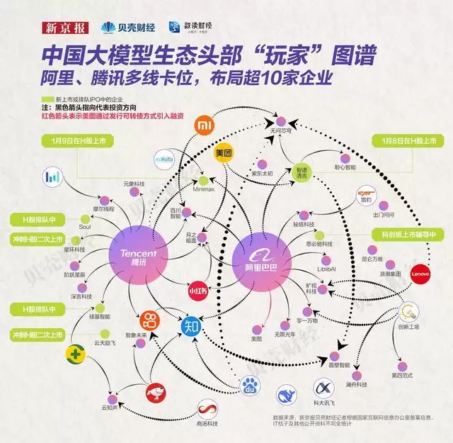 新京报贝壳财经记者基于大模型备案信息中涉及的数百家企业,结合媒体报道声量、对外投资及大厂投资情况,梳理出当前赛道核心“玩家”之间的关联图谱发现,腾讯与阿里集团分别投资了14家和13家相关企业,布局涵盖基础模型、应用平台与关键硬件设施,成为这一轮产业演进中对外投资布局最为广泛的两家互联网大厂。