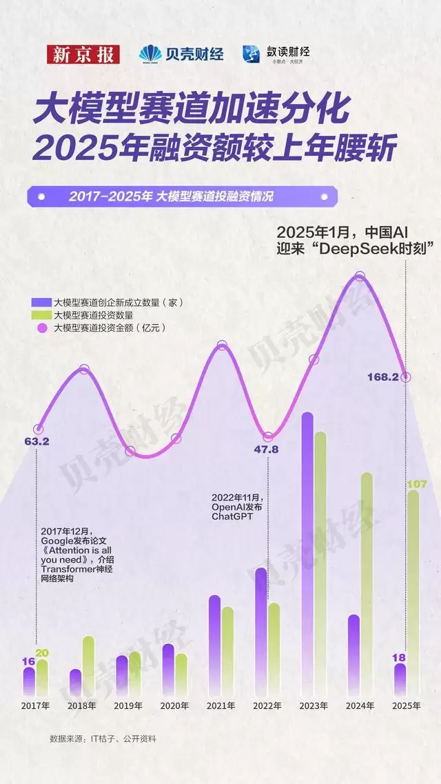 一方面,投融资端明显收敛,新进入者数量快速下降,资本开始向少数企业集中。IT桔子数据显示,近年来大模型(AIGC)赛道的新成立企业数量明显减少,2025年仅新增18家,显著低于2024年的147家;同期,行业投资金额也从2024年的372亿元腰斩,降至168.18亿元,几近腰斩。资本对大模型企业的要求,已经从早期的技术叙事转向了更清晰的商业确定性。