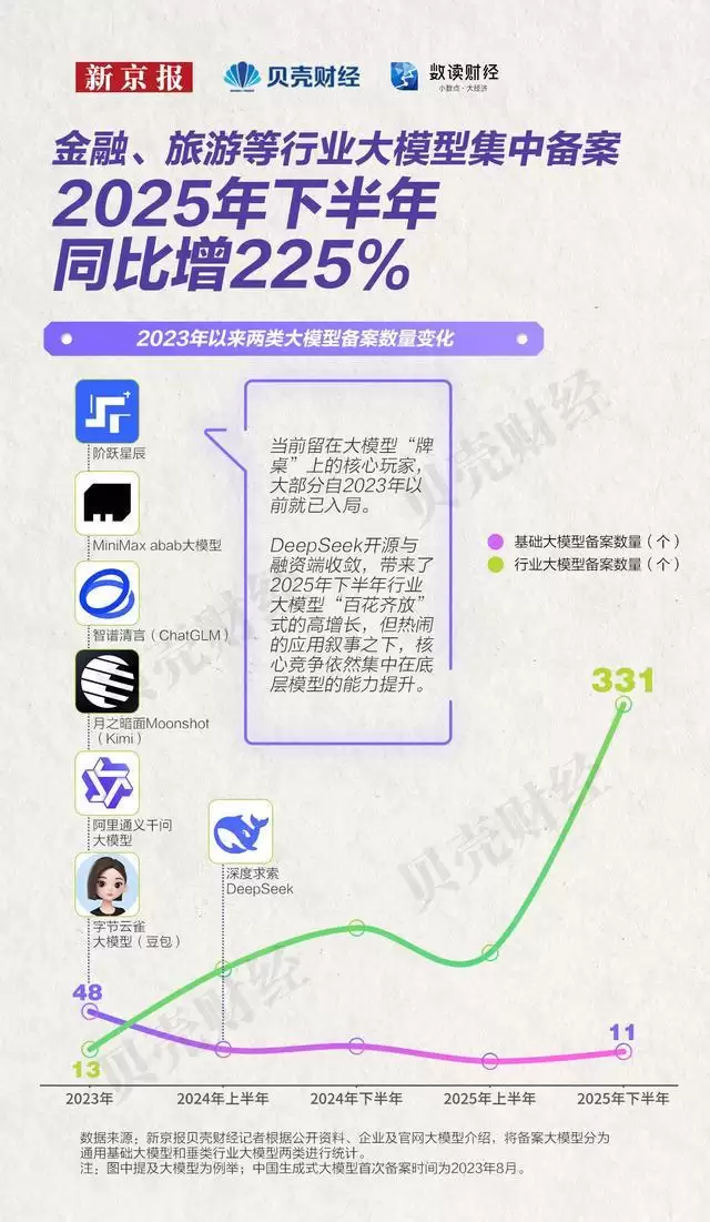 为回溯这一轮赛道分化的过程,新京报贝壳财经记者根据企业公开资料,将中国网信办备案的生成式大模型分为基础大模型和行业大模型两类。数据显示,自2024年8月生成式大模型首次备案启动,当年备案的61个模型中,基础大模型占比接近八成,行业大模型仅占两成。