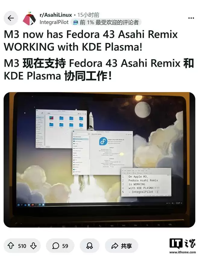 在已经稳定支持M1和M2系列芯片的基础上,社区开发者IntegralPilot昨日通过发布实机照片证实,搭载M3芯片的Mac现已能够运行集成了KDE Plasma桌面环境的Fedora 43 Asahi Remix。此外,他还成功完成了对M3 Pro和M3 Max芯片的初步测试。