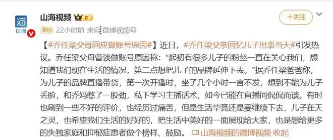 最近 #乔任梁父亲回忆儿子出事当天# 的话题刚引发热议,# 乔任梁父母回应做账号原因 #又跟着冲上热搜。