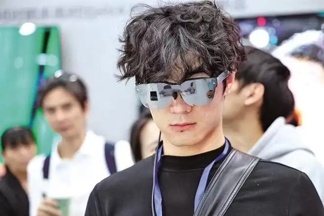 一位顾客一边试戴名为玄景M6的智能眼镜,一边对其即时创作与记录的功能赞不绝口:“眼镜戴着很轻便,在用第一视角拍vlog(视频博客)时,可以即时创作分享,十分自然。”