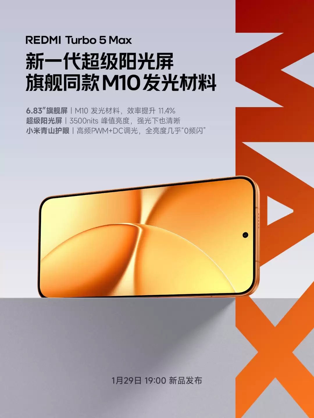 2026年1月27日,小米旗下Redmi品牌正式揭晓了Redmi Turbo 5 Max的核心配置,确认该机型将搭载一块名为“超级阳光屏”的6.83英寸高亮直屏,进一步完善其“一中一大”产品矩阵布局。