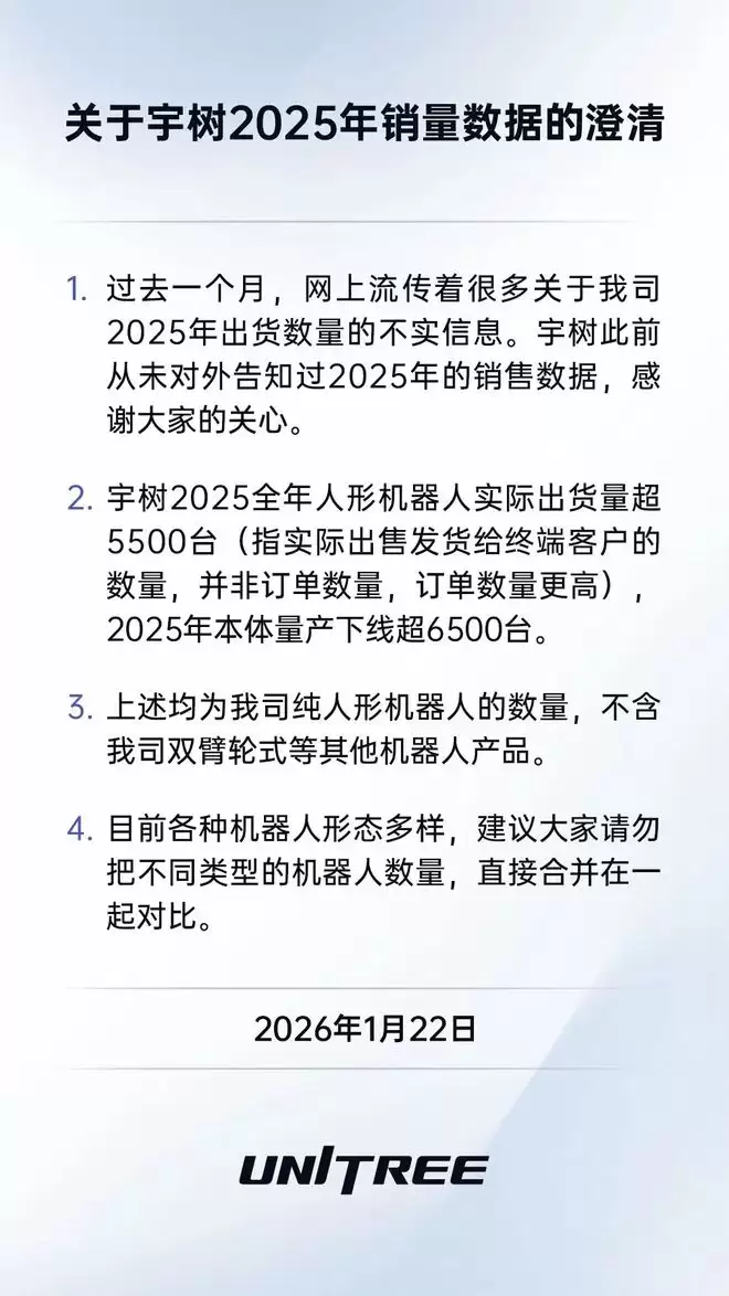 宇树透露,其 2025 全年人形机器人实际出货量超 5500 台,2025 年本体量产下线超 6500 台,以上两项数据均不含双臂、轮式等其他机器人产品。宇树还特别指出,「目前各种机器人形态多样,请勿把不同类型机器人数量,直接合并在一起对比」。
