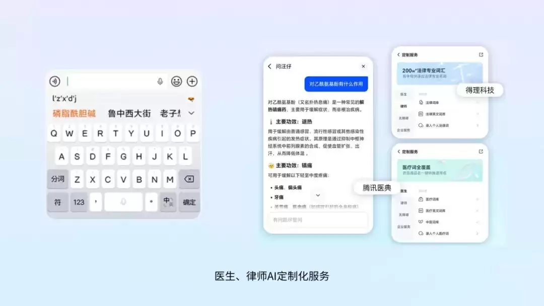 越来越多的专业人群也能获得针对性体验升级。通过与腾讯医典、得理科技等行业权威数据库合作,面向医生、律师等人群提供专业词库、信息快查与定制化输入服务。