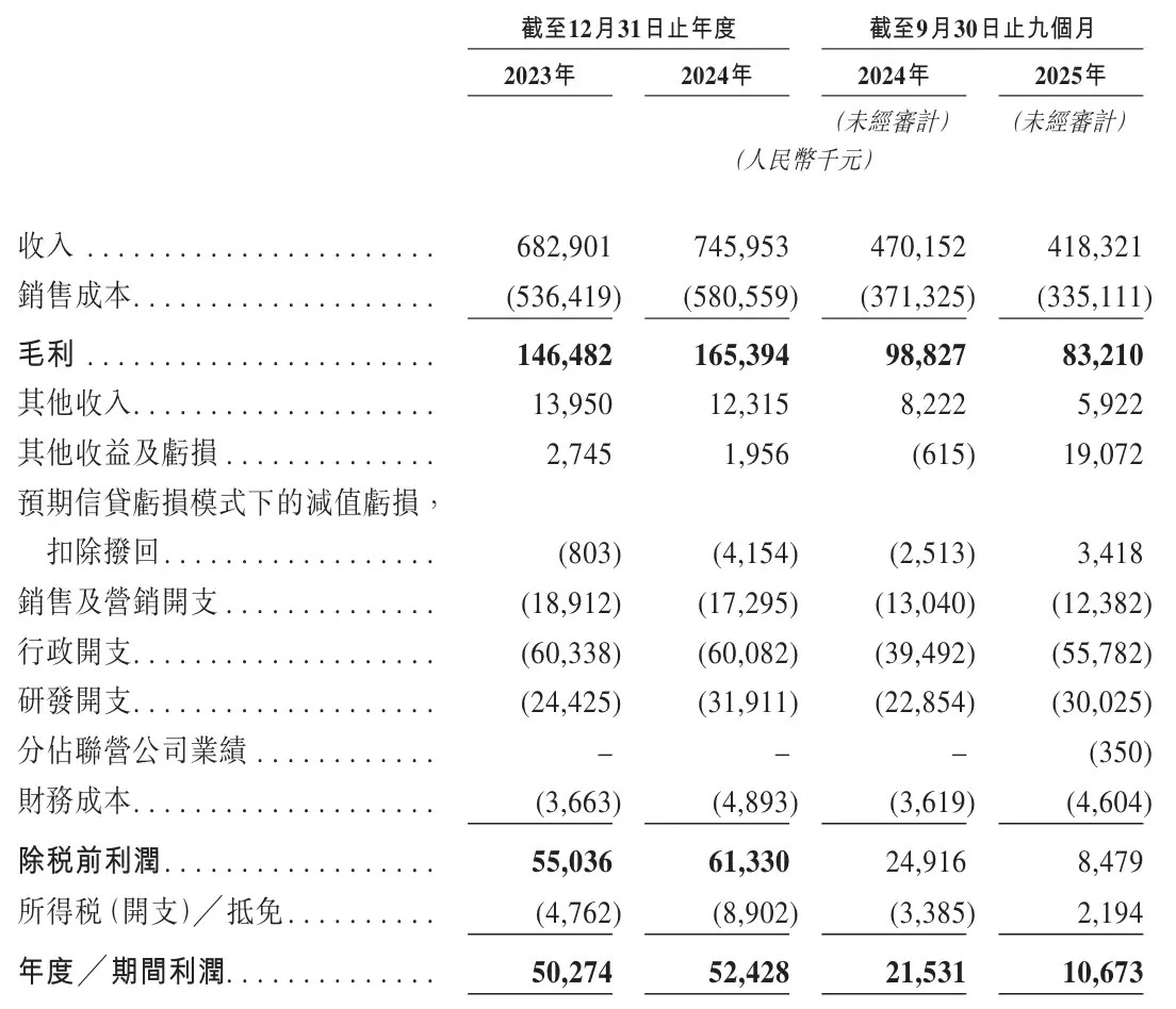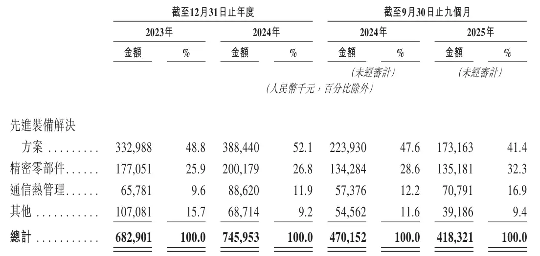 截至2025年前九个月,精智实业实现营业收入4.18亿元,毛利为8321万元,期内利润达到1067万元。从收入结构来看,先进装备解决方案贡献了1.73亿元收入,占比41.4%;精密零部件业务收入为1.35亿元,占比32.3%;通信热管理业务收入达7079万元,占比16.9%;其他业务收入为3919万元,占比9.4%。