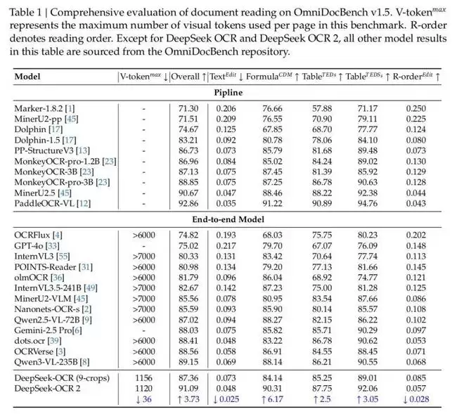 如表 1 所示,在使用最小视觉 token 上限(的情况下,DeepSeek-OCR 2 仍取得了 91.09% 的领先性能。与 DeepSeek-OCR 基线模型相比,在采用相似训练数据来源的前提下,其性能提升了 3.73%,验证了新设计架构的有效性。