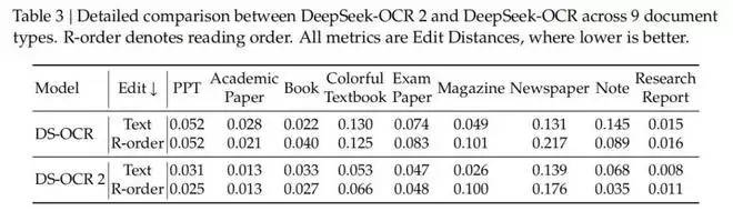 团队在 9 种文档类型上,对 DeepSeek-OCR 与 DeepSeek-OCR 2 进行了细致的性能对比,结果表明:DeepSeek-OCR 2 仍具有较大的提升空间,如表 3 所示。在文本识别的编辑距离(ED)指标上,DeepSeek-OCR 2 在大多数场景中优于 DeepSeek-OCR,但在某些类型上仍存在明显不足,例如报纸类文档,其 ED 超过 0.13。