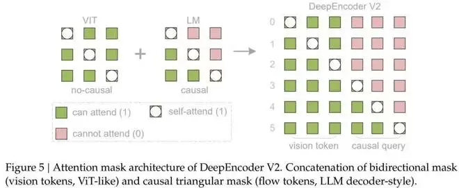为更直观地展示 DeepEncoder V2 的注意力机制,图 5 对其注意力掩码进行了可视化。该注意力掩码由两个相互区分的区域组成。