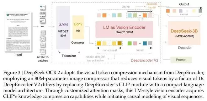 两者的关键区别在于编码器部分:DeepSeek 将原有的 DeepEncoder 升级为 DeepEncoder V2。在完整保留前代能力的基础上,DeepEncoder V2 通过一种全新的架构设计,引入了因果推理能力(causal reasoning)