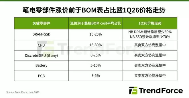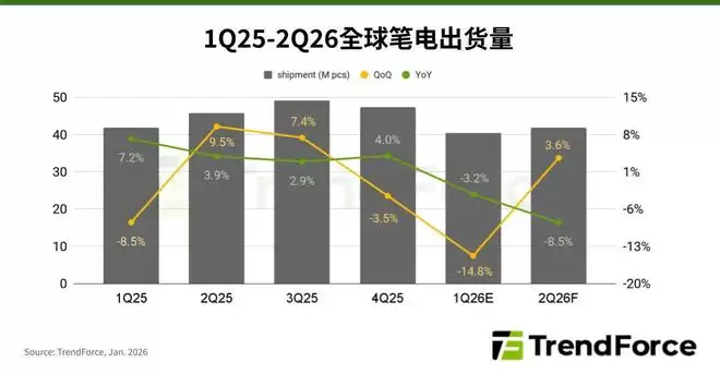 TrendForce:预计26年Q1笔记本出货量将环比下滑14.8%