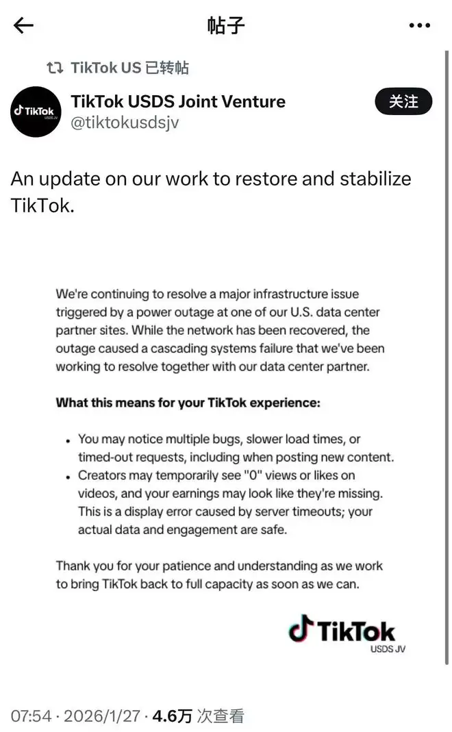 美国当地时间1月26日,TikTok美国数据安全合资有限公司(简称TikTok USDS合资公司)在社交平台X上发表声明,称其正全力解决因美国数据中心合作伙伴站点断电所引发的重大基础设施问题。“尽管网络已经恢复,但此次停电导致了一系列系统故障,我们正与数据中心合作伙伴共同努力解决这些问题。”