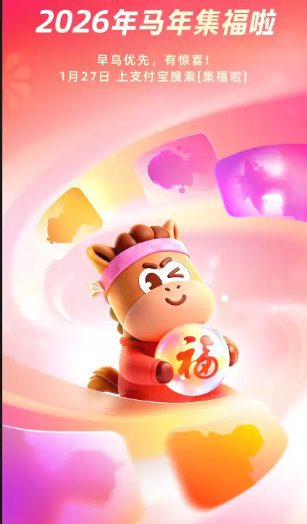 2026年支付宝马年集福活动将于1月27日正式开启。用户现在就能通过搜索“集福啦”提前参与活动。除了传统的五福以外,今年还特别新增了马年专属玩法,以及迪士尼、NBA等知名IP联名稀有福卡。具体的活动规则与总奖金额度,请留意后续官方发布的最新公告。