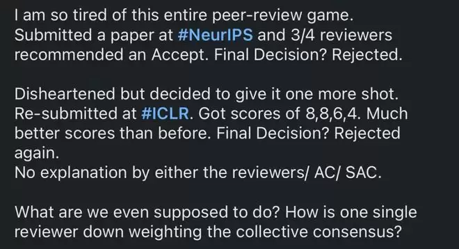 即使拿到了高分,即使多数审稿人都表示文章可以接收,只要一个审稿人就能推翻录用结果。