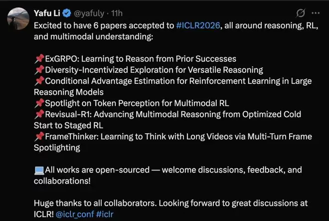 多名作者在国内外社交平台发文,祝贺ICLR 2026喜创佳绩。