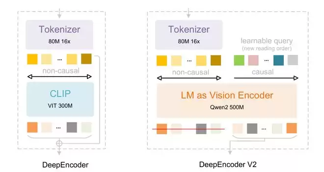 此次发布的 OCR 2 要解决的正是这个问题。新架构 DeepEncoder V2 做了一个关键改动:用一个小型语言模型(基于 Qwen2-0.5B,约 5 亿参数)替代了原有的 CLIP 模块,从而引入了“因果”机制。