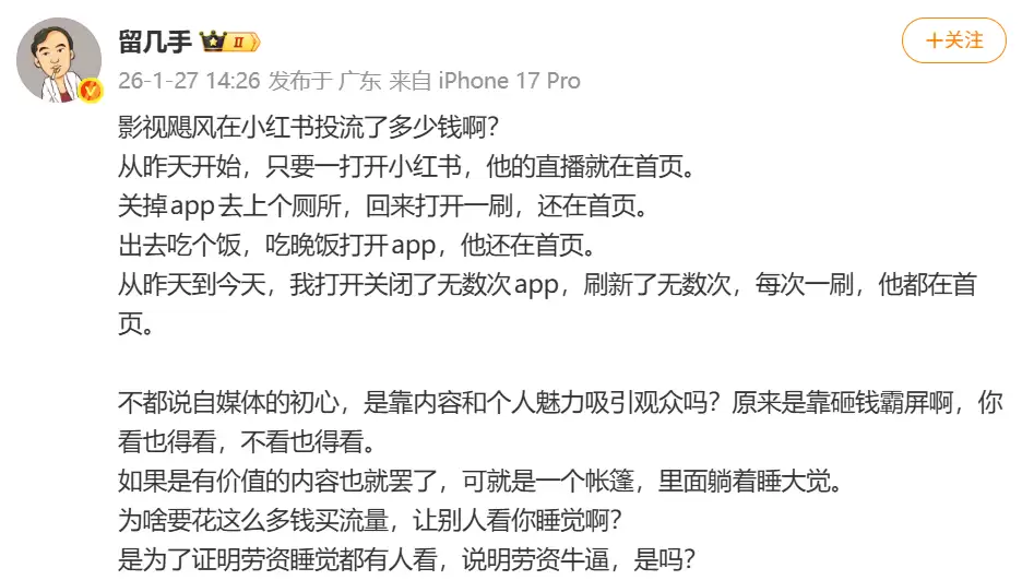 1月27日消息,网红“留几手”今日在微博发文称,影视飓风在小红书平台投入大量资源进行推广,以至于其内容长时间占据首页推荐位。留几手表示,从昨天开始,影视飓风创始人Tim的“雪地生存100小时”直播就持续占据小红书首页推荐位置,即便自己多次关闭并刷新小红书应用,该直播始终出现在首页。他直言,Tim此次的直播内容本身缺乏价值,仅仅是在帐篷里睡觉。
