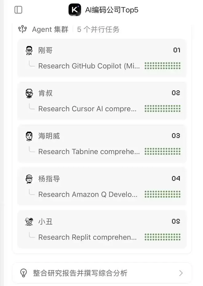 当你选择Agent集群模式,模型开始给你打造一个专业团队,100个agent集群可以同时并发,串行+并行来完成复杂任务。根据Kimi介绍,这些专项 agents 本质上都是 K2.5 的“分身”但各自承担不同的角色和子任务。