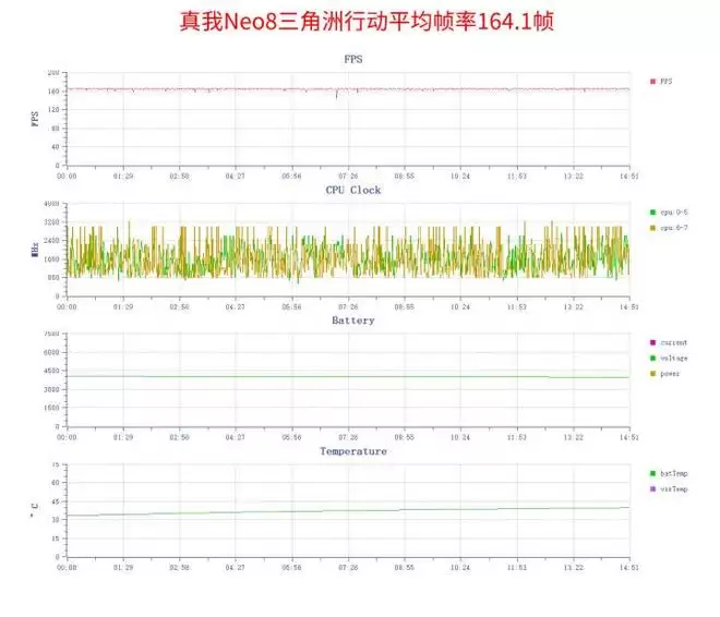 165帧游戏测试中,我们选用《三角洲行动》,设置为标准画质+165帧模式进行全面对战测试。一局20余分钟的游戏结束后,平均帧率达164.1帧,低帧也高达143.8帧,流畅度拉满。机身最高温度仅38.2℃,这种稳定且低发热的高帧表现,完全能满足核心电竞玩家的需求。